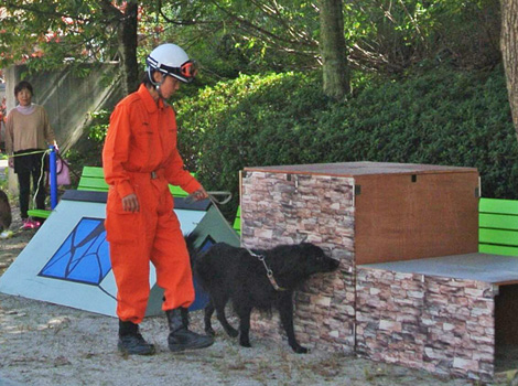 被災地は瓦礫や土砂が多く、足元が不安定で臭いもあります。そのような場所でも活躍するため、普段から障害物や土砂を用いた訓練が必要です。さらに瓦礫の隙間へ入っての捜索ができるようにする、伏せの状態で進む「クリープ」(人間でいう匍匐前進)など、必要な訓練は多数あります。