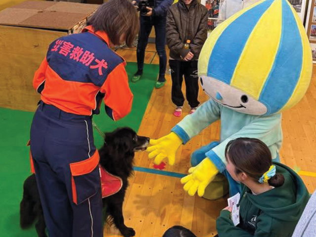 岐阜市立華陽小学校で行われた「華陽防災フェスティバル」に参加し、じゃがいもくんが災害救助犬の実演を行いました。