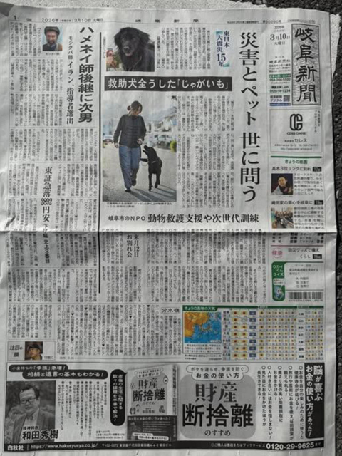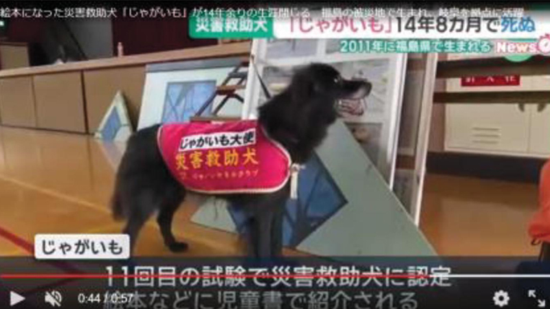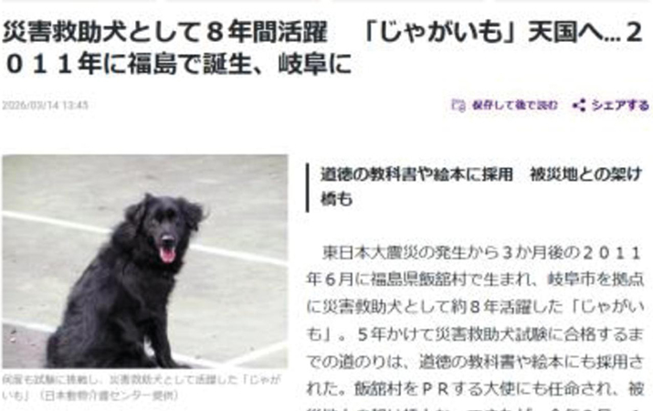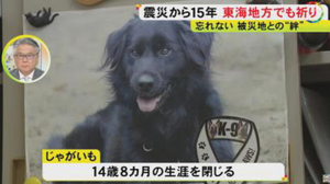 被災地生まれの災害救助犬じゃがいもくんが2月20日、14歳8か月の生涯を終えました。23日の葬儀では、ボランティアの皆さんとともに見送りました。みなさま方に応援・ご支援いただきありがとうございました。旅立ってからもこんなに取り上げていただき、本当に神様のような存在でした。
