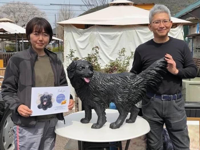 チェーンソーアートの世界チャンピョンでいらっしゃる城所ケイジさまより2017年に、じゃがいもくんの災害救助犬合格祝いにと実物代を製作いただきましたアート作品を、「4月12日のお別れ会に展示しようと思います」とご本人にお伝えしたところ、経年劣化で傷んだ部分を修復していただけました。ありがとうございました。